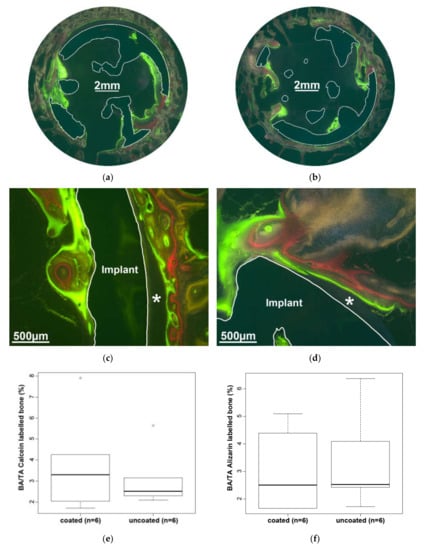 Overview and detail of a coated (a,c) and uncoated (b,d) implant (highlighted by a white border). The newly formed bone was labeled by three fluorochromes, Oxytetracycline (yellow), Alizarin Complexone (red), and Calcein (green), and shows the time point at which it was formed. An empty gap (c,d*) is visible between the outer surface of the implant and the bone. In the area of interest (AOI), the bone area over tissue area (BA/TA) of both Calcein- (e) and Alizarin (f)-labeled bone shows no significant differences between coated and uncoated samples. Oxytetracycline-labeled bone was not subject of the investigation.