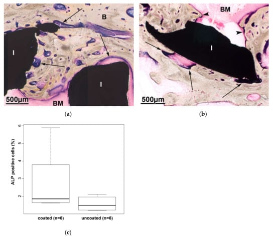 The purple blue coloring indicates the presence of active osteoblasts at the outside (arrow) and in the inside (arrowhead) of the implant (I), coated (a) and uncoated (b) specimen. (c) There are no statistically significant differences in the detection of alkaline phosphatase among the test samples.