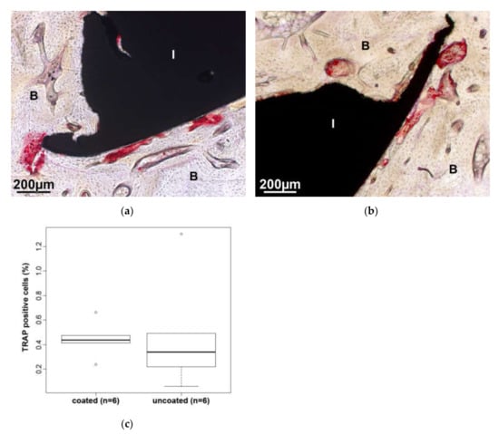 Several red tartrate-resistant acid phosphatase (TRAP)-positive cells are visible lining the coated (a) and uncoated (b) implant (I). (c) The ratio of TRAP-positive cells to bone in the AOI (measured as red areas) shows no significant differences between the two test groups.
