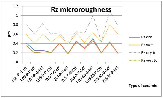 Absolute vertical roughness (Rz) microroughness values for all tested samples, dry and wet, before and after thermal cycling (tc).
