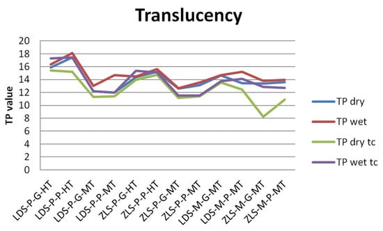 Regarding the TP parameter, LDS samples have higher translucency (mean value = 14.803, and 13.840 after tc), compared to ZLS (mean value = 13.857, and 12.454 after tc), but the difference is insignificant. Between dry and wet samples, the differences are significant after thermal cycling, for wet samples, the TP is higher. Related to processing procedures, the pressed samples and polished are significantly influenced by thermal cycling (p = 0.0007, respective p = 0.0001), the TP decreases. In all cases, the TP parameter decrease after aging, significant for dry samples. Milled samples have significantly higher TP values than pressed ones, and polished insignificant higher than glazed. Artificial aging decreases significant translucency (Table 2).