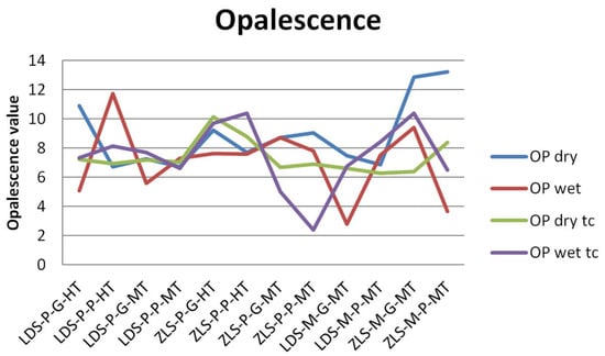 For OP values, the variations are insignificant, within all groups. It can be observed that ZLS samples have higher values than LDS samples, and after thermal cycling opalescence decrease for ZLS. OP values are 7.156 and 7.181 after tc for LDS, 8.797, and 7.633 after tc for ZLS.