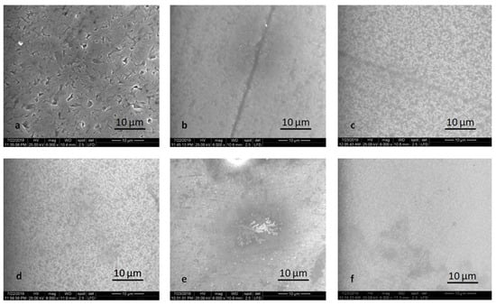 Glaze powder and liquid mixture homogeneously dispersed on the surface of the specimen provided smoother surfaces, from SEM point of view, with some inclusions for pressed samples, tiny for HT specimens, and more significant for MT specimens (Figure 6).