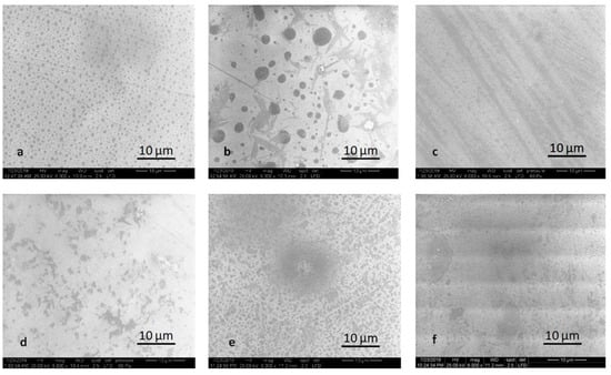 SEM images of the polished samples after thermocycling: (a) LDS-P-P-HT, (b) LDS-P-P-MT, (c) LDS-M-P-MT, (d) ZLS-P-P-HT, (e) ZLS-P-P-MT, and (f) ZLS-M-P-MT.
