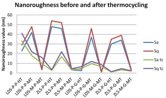 Regarding processing technologies, pressed samples are significantly influenced (p = 0.0003) by thermal cycling. There is a significant difference between polished and glazed samples, before thermal cycling (p = 0.361); the polished samples have higher nanoroughness than the glazed once.