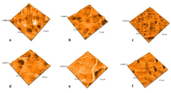 Each ceramic sample was examined before and after thermal cycling with an atomic force microscope Nanosurf Easy Scan 2 Advanced Research (NanosurfAG, Liestal, Switzerland), and values for average nanoroughness Sa (nm) and maximal nanoroughness Sq (nm) were registered. The imaging mode is made in contact and the oscillating frequency of the tip is 50 Hz. AFM generated after examination of a three-dimensional image of the sample surface (2.2 µm × 2.2 µm).