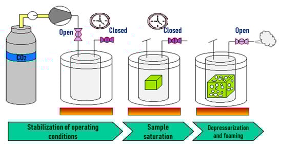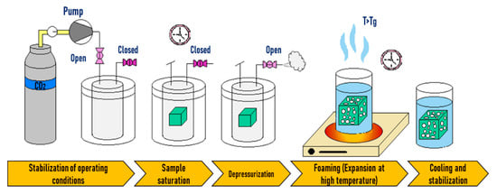 In temperature-induced batch foaming, saturation with the blowing agent is achieved at low temperatures (10–25 °C) and low pressures (2–5 MPa). The saturated sample can be taken out of the vessel without an immediate expansion as shown in Figure 2. By plunging the saturated sample in a hot liquid such as water, glycerine, or oil, foaming is originated, the temperature (above the Tg) leads to (i) an increase in the chain mobility at the same time that the polymer gets softened and (ii) a drop in the solubility of the gas in the polymer. Consequently, this results in cell nucleation and growth. To ensure the stabilization of the foam, a cooling step is necessary [132].