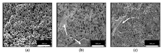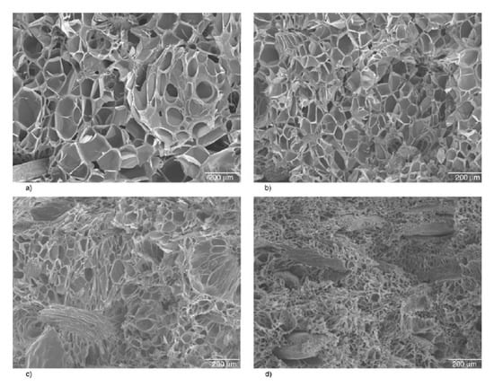 Rizvi et al. [122] prepared PLA/chitin nanowhisker foams. In this work, composites with chitin (PLA/C), chitin nanowhiskers (PLA/nC), and a compatibilized composite using 2 wt% of grafted maleic acid (PLA/nC-gMA) were foamed. In general, the addition of chitin resulted in a decrease in the foam density compared with the neat PLA foam. However, when varying chitin content, an ANOVA statistical test suggested that there was no significant difference between the different content’s means. Therefore, there was no significant effect of chitin content on the foam densities of PLA/C composites. For their part, Matuana and Faruk [123] studied the effect of wood flour content on the cellular structures of PLA/wood flour foams (Figure 4) All microcellular foamed PLA/wood flour composite samples had cells with finer average size than their neat PLA counterpart. The cell size decreased as the wood flour content increased in the matrix. The incorporation of wood flour into the PLA matrix produced this expected effect, as it increased the melt viscosity of the matrix and made the composites stiffer than the unfilled PLA, which provided high resistance to the cell growth in the polymer matrix. Increasing the wood flour content in the PLA matrix tended to noticeably decrease the expansion ratio of PLA in foamed samples.