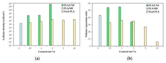Figure 6 compares the cellular density and expansion ratio of the obtained foams. It can be noticed that CNFs produced foams with a higher expansion ratio and cellular density than MFs at the same content. Compared to the neat PLA, CO2 had a lower solubility in PLA composites, especially PLA/MF composites, which may result in lower expansion ratio (Figure 6b). The author assumed that the operating foaming temperature might have been too high for the neat PLA and PLA/MF composites. However, high cell densities and high volume expansion ratios were obtained for low CNF content composites (0.5 and 1 wt%) even with a lower amount of dissolved gas (vs. neat PLA and PLA/MF composites). This is attributed to the unique features of CNFs (i.e., large surface area and long aspect ratio), which significantly changed the thermal and rheological properties of PLA. Indeed, the increase in PLA viscosity was more pronounced with CNFs than with MFs, even at low contents such as 0.5 wt%. Besides, the higher surface area and aspect ratio of CNFs provided more interfacial area and greater interactions between CNFs and PLA chains by forming a network structure.