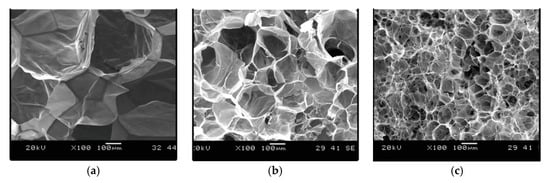 Effect of pressure on cell morphology of PLA/silk foams (7 wt%, 155 °C) at (a) 16 MPa, (b) 20 MPa, and (c) 24 MPa. Reprinted from Kang et al. [129]. Copyright © 2020 WILEY-VCH Verlag GmbH & Co. KGaA, Weinheim.