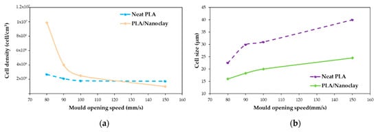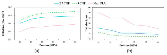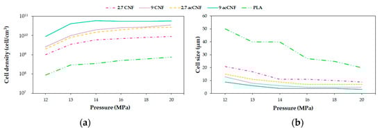Effect of pressure in (a) cell density and (b) cell size of PLA/CNFs foams. Data taken from Dlouhá et al. [126].