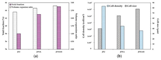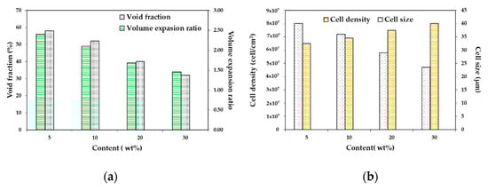 Effect of jute fiber content on the foam microstructure of the PLA/jute fiber biocomposites; (a) void fraction and volume expansion ratio and (b) cell size and cell density. Data taken from Zafar et al. [128].