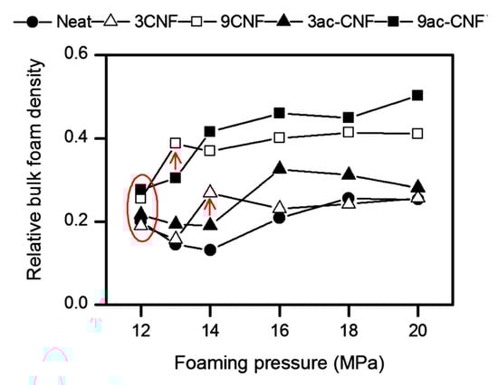 Variations of the relative bulk foam density of PLA foams as functions of foaming pressure. Arrows indicate the foaming pressure at which the relative bulk foam density increases suddenly for the CNFs composites. Reprinted from Dlouhá et al. [126]. Permission conveyed through Copyright Clearance Center, Inc.