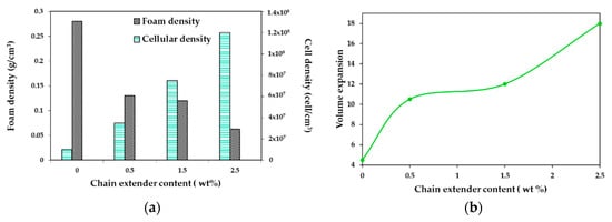 Figure 15 depicts the density, expansion ratio, and cell density of the foamed samples as a function of the CE content. The volume expansion ratio shows an increase with increasing CE concentration (up to 18 times when 2.5 wt% of CE was added). Consequently, the apparent density decreased. A further drawback of PLA is that it has poor thermal stability and could undergo chain-scission during processing. Coalescence, cell rupture, and collapse were observed when CE was not used; this could happen because, during the foaming process, the melt could not tolerate the strain induced by the cell expansion and growth. With the use of a chain extender, the PLA formed a branched structure which improved the melt strength, thus reducing cell coalescence and avoiding cell collapse; most of the bubbles during cell growth could preserve its form, which in turn increased the expansion ratio and reduced the apparent density of composite foams.
