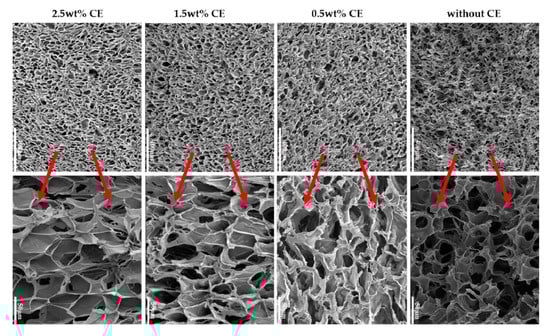 CE showed a significant effect on the cell structure of the composite foams (Figure 16). A dramatic cell rupture was observed when CE was not present, which led to a high open-cell ratio caused by the poor melt strength of PLA. A cell wall thinning was obtained when adding 0.5 wt% and a better morphology was achieved. However, due to the lack of resistance of the composite to stretching, the cells still displayed an abnormal shape. Further increasing the extender content from 1.5 wt% to 2.5 wt %, the cell morphology was much better. Cells developed a polygon shape and it can be said that at this concentration, the chain extension reaction occurred to ensure that most of the PLA chains had a branched structure, leading to a higher melt strength and strain-hardening behavior during the foaming process. According to the authors, the biaxial extension stress around each cell was uniform, so the foamability was markedly improved and the final cell adopted a regular shape.