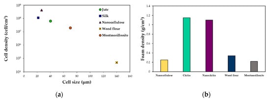 (a) Cell density and cell size for different fillers at 5 wt% content in PLA and (b) foam density for different fillers between 3 and 5 wt% contents in PLA. Data taken from Zafar t al. [128], Kang et al. [129], Cho et al. [125], Neagu et al. [127], and Ema et al. [131].