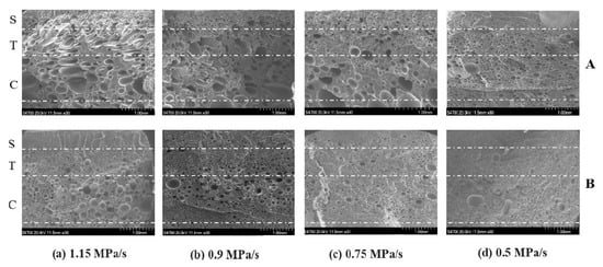 Boissard et al. [124] foamed PLA/microfibrillated cellulose (MFC) composites at different temperatures and depressurization rates (dP/dt). Decreasing T and dP/dt resulted in reduced cell size and a narrower cell size distribution for all the materials. Coalescence was more obvious at high T and high dP/dt, resulting in significantly increased cell sizes locally. At the operating conditions, the low viscosity of the polymer melt was presumed to promote the decrease in the cell wall and, as a consequence, the gas diffusion was facilitated. When rapid stabilization was not applied, coalescence and open cell structures were favored. The most homogeneous structures were obtained with T = 155 °C and dP/dt = 4 bar/s. A similar result was obtained by Kang et al. [129], who used silk fibroin powder from silkworm cocoons to produce PLA/silk composite foams. The cell size continuously increased with the increase in the saturation temperature. Accordingly, cell density decreased.