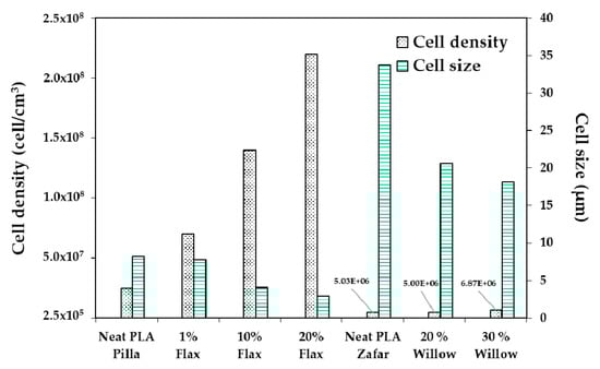 Foaming of PLA and jute fiber biocomposites was carried out by Zafar et al. [128]. It can be observed in Figure 11 that when increasing the jute fiber load, the cell density increased and the cell size dropped. This may be explained by the presence of jute fibers in the PLA matrix providing heterogeneous nucleation sites. Increasing the jute fiber content drove a further increase in the melt viscosity of the matrix, which led to difficulty in cell growth and thus a reduction in average cell size. Besides, adding the jute fibers to the PLA matrix meaningfully reduced the void fraction and expansion ratio of the foamed biocomposites. A similar result was obtained by Kang et al. [129], who used silk fibroin powder to produce PLA/Silk biocomposite foams. The average cell size decreased with increasing silk load, and the cell density increased simultaneously. For a given foaming condition, the higher filler content limited gas expansion, thus leading to a foam with a lower porosity and less interconnected pores. The decreased cell size with higher filler contents could be explained by a good interface between the two components, which favored the presence of CO2 in the polymer matrix.