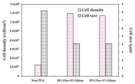 Foaming of PLA and jute fiber biocomposites was carried out by Zafar et al. [128], and fiber surface treatment on foam morphology was evaluated. PLA/jute fiber (5 wt%) biocomposites with untreated jute fibers (JFU), NaOH-treated jute fiber (JFNA), and (NaOH + silane)-treated jute fibers (JFNASI) were prepared. The amount of CO2 present in the PLA matrix was strongly dependent on the nature of the matrix–fiber interfacial adhesion. In PLA/JFU biocomposites, untreated jute fibers provided weak matrix–fiber interfacial adhesion, which produced a channel through which the CO2 can quickly escape from the matrix to the outer environment. In PLA/JFNA biocomposites, NaOH treated jute fibers allowed stronger matrix–fiber interfacial adhesion. The interfacial adhesion in PLA/JFNASI biocomposites was the strongest due to the (NaOH+silane)-treated jute fibers. As the interfacial adhesion between jute fibers and PLA increased, the concentration of CO2 increased in the matrix, enlarging cell size and lowering the cell density. The void fraction and expansion ratio of the foamed biocomposites increased from JFU to JFNA and then to JFNASI, as seen in Figure 12.