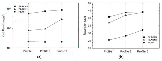 (a) Cellular density and (b) volume expansion ratio for PLA/cellulose foam composites. Data taken from Ding [120].