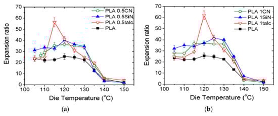 In general, increasing the filler content in the PLA matrix tended to noticeably decrease the expansion ratio of PLA in foamed samples. This tendency could be attributed not only to the number of nucleated cells and their growth, which controls the volume expansion ratio (or void fraction) during the foaming process, but also to the strong dependency on the amount of gas molecules dissolved in the material as well as the volume fraction of matrix in the composite [127]. Consequently, less gas was absorbed by the composite samples during foaming compared to that absorbed by neat polymer, and the resulting expansion and void fraction were lower.