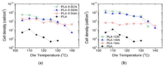 Currently, the mass production of low-density PLA foams with a uniform cell morphology using sc-CO2 or sc-N2 as blowing agents is a challenge. This is mainly due to PLA’s low melt strength and its slow crystallization kinetics. The melt strength corresponds to a measure of the extensional viscosity and can be described as the resistance of the polymer melt to stretching. This property, which is closely related to the intrinsic rheological behavior of PLA and processing conditions, is critical during the growth phase of the cells to limit coalescence and obtain uniform cell morphology [10]. In the previously listed works, different strategies were tested in order to improve the PLA foamability: (i) introducing a chain extender to create a branched structure [97,98,99], (ii) modifying the L/D ratio of the PLA molecules [100,101], or (iii) varying the PLA molecular weight [97,100,101,102]. These macromolecular approaches proved to be efficient in improving PLA foamability thanks to enhanced crystallization rate and melt strength [13]. Likewise, compounding PLA with different types of fillers appears to be an alternative or complementary option.