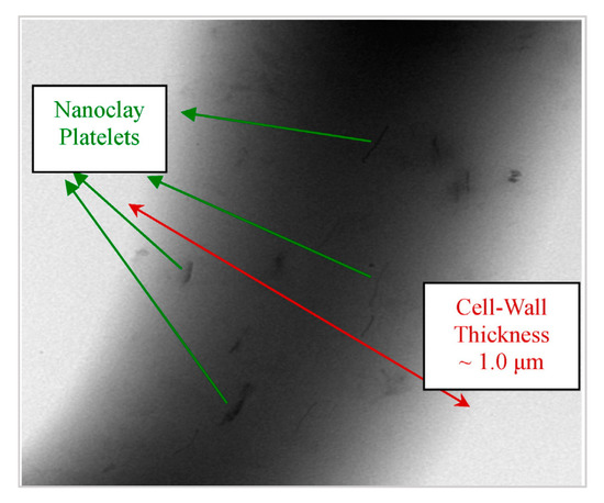 Potential fillers can vary in origin from lignocellulosic fibers from different sources [103,104] to mineral ones, especially talc [105,106], clays [90,107], and silicates [108,109], as well as in terms of size, from micro- [110] to nanoparticles [109,111,112], and shape. The presence of a filler in the polymer melt can increase the cell nucleation rate during foaming, acting as a heterogeneous nucleation agent [44,45,46], and also can increase the melt strength [105,106] and the crystallization rate of PLA [113,114]. Compounding PLA with fillers does not only have foaming advantages, but can also improve the performances of the final composites. When using lignocellulosic fibers, mechanical properties of the composite such as Young’s modulus, tensile strength, elongation at break, among others, can be tailored by changing the characteristics of the fiber [103]. Nanoclay particles can improve the flame retardancy when added to a polymeric matrix [115]. Nanocellulose-reinforced nanocomposites have enhanced electrical conductivity [116,117] and mechanical properties [111], and layered silicate-reinforced nanocomposites showed enhanced tensile and flexural modulus, increased heat distortion temperature, reduction in flammability, and increased barrier for gases and liquids, among others [109].