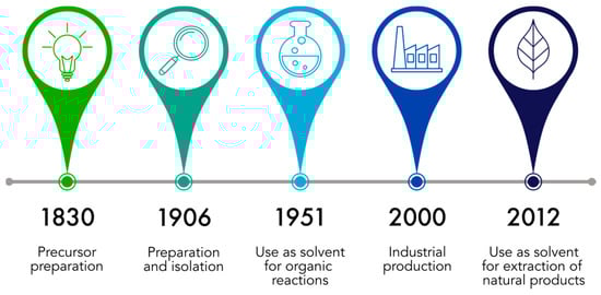To the best of our knowledge, 2-MeOx was first prepared and isolated in 1906 [], during research on furfural, which was discovered 76 years before (Figure 2). At that time, there were plenty of resources available to produce furfural and researchers were trying to find uses for it, either directly or through an impressive number of derivatives []. Due to its interesting properties, 2-MeOx was first employed as a reaction medium in 1951 in laboratories []. Almost 100 years were necessary between its first isolation and its efficient production at an industrial scale []. It is only a few years ago, in 2012, that 2-MeOx began to draw the attention of researchers working on the extraction of natural products while searching for alternative to benchmark petrochemical solvents.