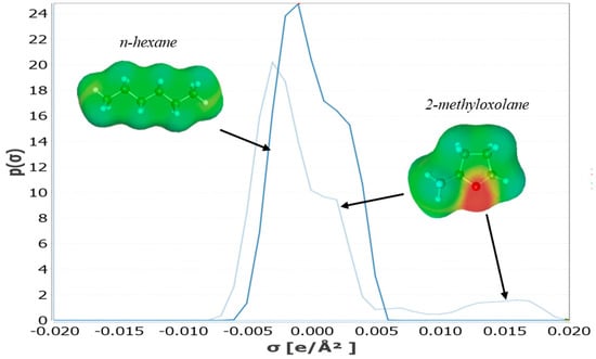σ-surfaces and σ-profiles of 2-MeOx vs. n-hexane. Yellow/Red: molecule charge density <0, Green: molecule charge density = 0 [].