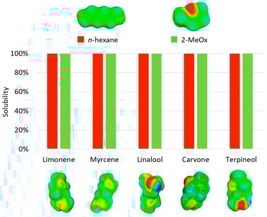 To help scientists to find a convenient solvent, predictive tools such as the Hansen Solubility Parameters or COSMO-RS have been used to evaluate the solvation of a molecule in a solvent. To illustrate, the solubilities of several aroma compounds in n-hexane (main isomer of extraction-grade hexane) and 2-MeOx were calculated using COMO-RS and are shown in Figure 4. These results indicate that both n-hexane and 2-MeOx can effectively solubilize aromatic molecules such as limonene or carvone. However, the efficiency of extraction of compounds from a matrix is a complex process that cannot be simulated considering only the solvation parameter. Therefore, the results given by predictive tools are only the first step to find the best solvent and have to be combined with experimental studies. Recent works combining both approaches for hexane substitution by 2-MeOx are reported in Table 2.