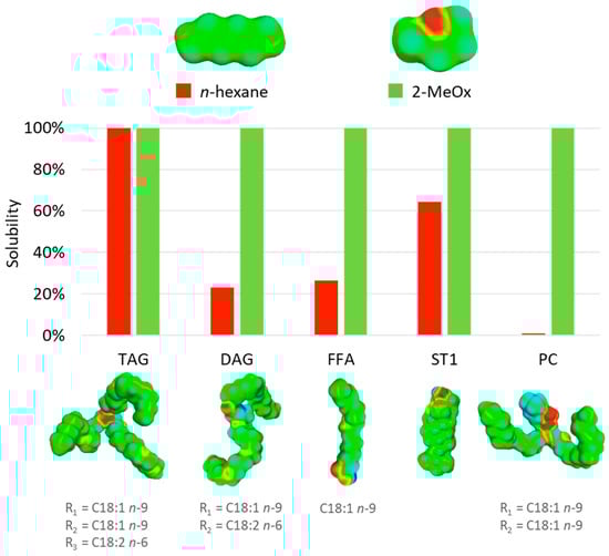 Representation of predicted solubilities of some lipids in n-hexane and 2-MeOx and their corresponding sigma surfaces, from [,]. TAG = Triglycerides, DAG = Diglycerides, FFA = Free fatty acid, ST1 = β-sitosterol, PC = Phosphatidylcholine. Rating: 0–20% bad solvent; 20–60% average solvent; 60–100% good solvent.