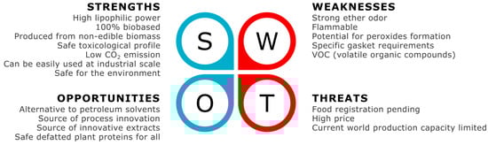 In this 21st century, extraction solvents have to be exclusively green, safe, and obtained only from renewable resources. Based on this literature review, it is clear that 2-MeOx is a credible alternative to hexane for the extraction of lipophilic natural products; 2-MeOx also opens new area of innovations, as it proved to be a viable and green alternative to hexane and related lipophilic petroleum solvents, but there are still some key challenges and barriers. Figure 13 is an attempt to summarize in a strengths, weaknesses, opportunities, threats (SWOT) analysis the current perspectives for 2-MeOx use as extraction solvent, from laboratory innovation to industrial applications. Briefly, even if 2-MeOx has some drawbacks (flammability, potential peroxides formation) they are totally compatible with large scale industrial use (2-MeOx is currently used in pharmaceuticals industry), and some of them are also a source of embedded safety (strong odor) for workers and consumers. Having interesting technical properties, a safe toxicological profile and low environmental impact, 2-MeOx has the potential to become the most credible alternative to hexane for extraction of natural products and can be a source of innovations (process and products). For example, 2-MeOx could be used in mixture with other bio-based solvents, such as ethanol or water, for specific extraction of more hydrophilic products (polar lipids, polyphenols, sugars, etc.).