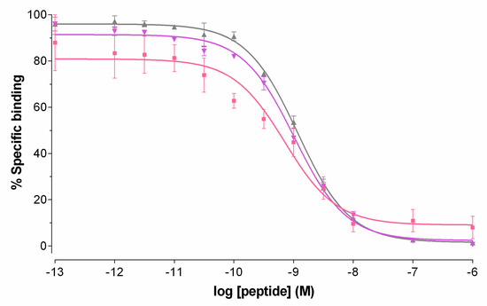 Several analogs of the frog 14 peptide bombesin (BBN; Pyr–Gln–Arg–Leu–Gly–Asn–Gln–Trp–Ala–Val–Gly–His–Leu–Met–NH2) and its C-terminal BBN(6–14) fragment, showing high GRPR affinity, have been derivatized with the appropriate chelator for stable binding of the selected medically relevant radiometal and have been evaluated in animal models and in humans [8,11]. It should be noted that such analogs internalize into target cells and display agonistic profiles at the GRPR. Agonism at the GRPR, however, translates into adverse effects elicited in patients after intravenous injection of BBN analogs and the GRPR activation that follows [12,13,14]. Such effects intensify at the higher peptide doses administered during radionuclide therapy, thereby restricting the broader clinical use of GRPR agonists. A subsequent shift of paradigm from GRPR radioagonists to antagonists revealed unexpected benefits in their use beyond the anticipated inherent biosafety. The clearance GRPR radioantagonists, in contrast to agonists, turned out to be much faster from physiological tissues than from tumor sites [15]. The basis for this clinically appealing feature has not been elucidated yet, although it has been observed for other receptor radioantagonists as well [16].