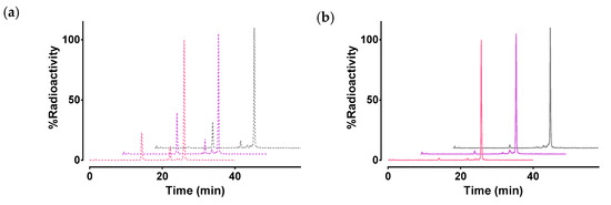 Representative HPLC radiochromatograms (System 2) of mouse blood collected 5 min after iv injection of [99mTc]Tc-DB7 (pink lines), [99mTc]Tc-DB13 (violet lines), and [99mTc]Tc-DB14 (gray lines) (a) without (dotted lines) or (b) with PA coinjection (solid lines); results represent average values ± SD, n = 3.