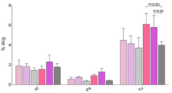 Selected biodistribution data for [99mTc]Tc-DB7 (pink bars), [99mTc]Tc-DB13 (violet bars), and [99mTc]Tc-DB14 (gray bars) for kidneys (Ki), pancreas (Pa), and PC-3 tumors (Tu) at 4 h pi in female SCID mice bearing subcutaneous PC-3 xenografts; results are expressed as %IA/g mean ± SD, n = 4, without (checkered bars) or with coinjection (solid bars) of PA. Only statistical differences in organ/tumor uptake across compounds are included in the diagram; statistical differences between PA-treated and nontreated mice are shown in Table 1, Table 2, and Table 3.