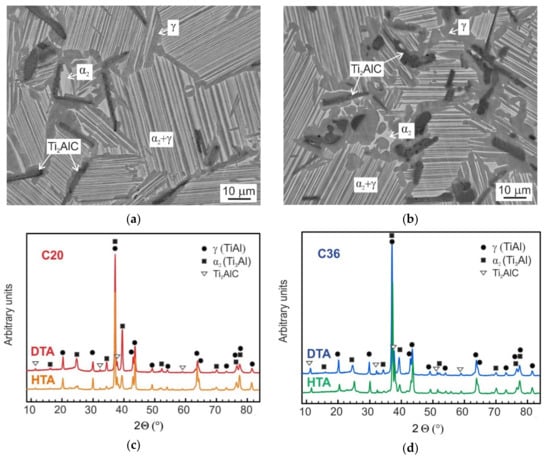 The alloys with nominal composition Ti-42.6Al-8.7Nb-0.3Ta-2.0C and Ti-41.0Al-8.7Nb-0.3Ta-3.6C (in at.%) designated as C20 and C36, respectively, were prepared by vacuum induction melting in graphite crucibles followed by a centrifugal casting into a graphite mold. The as-cast alloys were subjected to hot isostatic pressing (HIP) at a temperature of 1260 °C to remove casting porosity. Table 1 summarizes the measured chemical composition of the studied alloys. The alloy C36 differs from the alloy C20 in the content of C, which is increased from 2.0 to 3.6 at.% mainly at the expense of a decrease in the content of Al from 42.6 to 41.1 at.%. The measured content of impurities such as oxygen and nitrogen do not exceed 800 wt.ppm and 100 wt.ppm, respectively. Figure 1a,b show the typical microstructure of differential thermal analysis (DTA) samples after cooling from a temperature of 1450 °C at a constant rate of 15 °C/min. Figure 1c,d show the X-ray diffraction (XRD) patterns of the DTA samples indicating the presence of three coexisting phases: γ-TiAl (tetragonal crystal structure, L10), α2-Ti3Al (ordered hexagonal crystal structure, D019), and H-Ti2AlC (hexagonal crystal structure, Pearson symbol hP8). Chemically, three different phases and two regions (lamellar and grain boundaries) can be identified in the microstructure of the studied alloys, as seen in Figure 1. Table 2 summarizes the measured chemical composition of the coexisting phases in the C20 and C36 alloys.