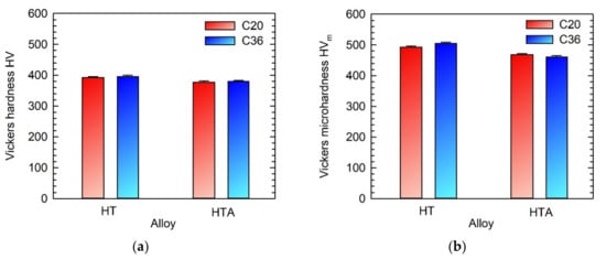 (a) Vickers hardness HV and (b) Vickers microhardness of lamellar grains HVm of C20 and C36 alloys after heat treatment and heat treatment combined with ageing. The type of alloys and applied treatments are marked in the figures.