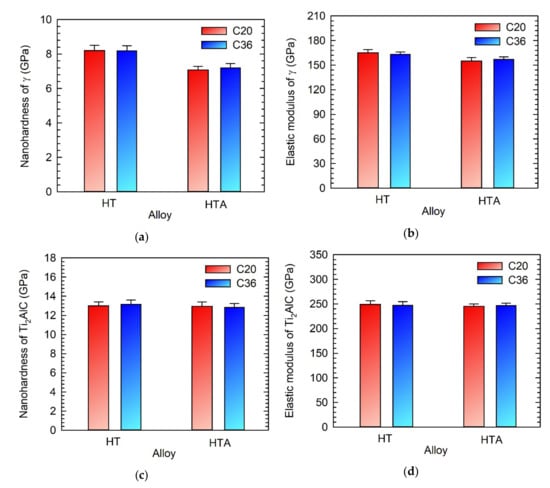 Indentation nanonahardness and elastic modulus of C20 and C36 alloys after heat treatment and heat treatment combined with ageing: (a) Indentation nanohardness of grain boundary γ phase; (b) Indentation elastic modulus of grain boundary γ phase; (c) Indentation nanohardness of primary Ti2AlC particles; (d) Indentation elastic modulus of primary Ti2AlC particles. The type of alloys and applied treatments are marked in the figures.