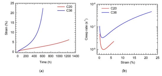 Creep deformation curves of C20 and C36 alloys at a temperature of 800 °C and applied stress of 200 MPa: (a) Dependence of creep strain on time; (b) Dependence of creep rate on strain. The studied alloys are indicated in the figures.