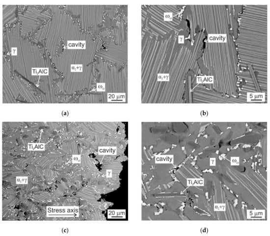 Figure 10 shows the typical microstructures of the C20 and C36 creep specimens tested to a strain of 6.2 and 22.4%, respectively. Figure 10a,b indicate that the deformed lamellar grains of the C20 alloy contain relatively stable α2 lamellae and the primary plate-like Ti2AlC particles are not fragmented and pin effectively the grain boundaries. The main microstructural instabilities can be related to the formation of numerous ωo particles and cavities of various size along the lamellar grain boundaries. The cavitation along the grain boundaries strongly depends on the orientation of the neighboring grains. The soft oriented grains have lamellae inclined at an angle of 35° or 75° and hard oriented grains have lamellae parallel or perpendicular to the stress axis []. The cavities formed along the hard/hard oriented grains are usually larger in size than those formed between the soft/hard oriented grains []. The creep of the C36 alloy is accompanied by bending and fragmentation of some plate-like and irregular shaped Ti2AlC particles, the formation of numerous ωo particles, and widening of the grain boundaries at the expense of decreasing volume fraction of lamellar colonies. The ωo phase is preferentially formed along the grain boundaries and frequently at Ti2AlC/matrix interfaces, as shown in Figure 10c,d. The ωo particles formed along the grain boundaries interlock the neighboring grains, reduce effectively grain boundary sliding, and improve fracture resistance by preventing the formation of grain boundary wedge cracks. The formation of the γ + ωo + Ti2AlC type of microstructure along the grain boundaries between the soft/hard and hard/hard oriented grains affects significantly the cavitation mechanisms and fracture resistance of the C36 alloy. The deformation occurring continuously in the soft boundary γ phase leads to the nucleation and coalescence of the cavities. The growth of cavities formed along the grain boundaries is controlled by diffusion and strongly affected by the creep induced formation of secondary phases [,]. The fracture of the C36 alloy occurs due to overloading with the fracture path propagating preferentially intergranularly, as seen in Figure 10c.
