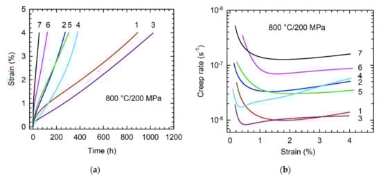 Creep deformation curves at a temperature of 800 °C and applied stress of 200 MPa: (a) Dependence of creep strain on time; (b) Dependence of creep rate on strain. Designation and composition of reference alloys (in at.%): 1—studied C20 alloy, 2—studied C36 alloy, 3—Ti-46.4Al-5.1Nb-1C-0.2B, 4—Ti-46Al-8Ta, 5—Ti-45Al-2W-0.6Si-0.7B, 6—Ti-46Al-2W-0.5Si and 7—Ti-44.6Al-7.9Nb-3.6C-0.7Mo-0.1B.