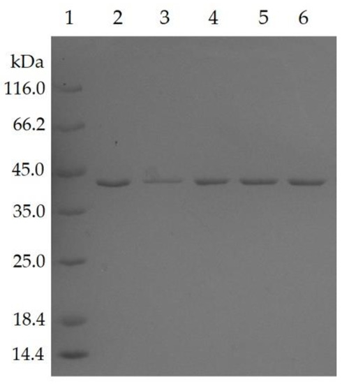 Five residues of T1 lipase have been identified to form additional hydrogen bond and ion-pair interaction in a space-grown crystal structure [15]. Following this, the residues were targeted to construct five single mutants, namely D43E, T118N, E226D, E250L, and N304E using a QuikChange Lightning Mutagenesis kit (Stratagene, Agilent Technologies, Santa Clara, CA, USA). The sequence alignment of mutated lipases also pointed to the presence of nucleotide change at preferred residue positions (Figure S1). All mutated lipases were subjected to purification by affinity chromatography (Ni-Sepharose High Performance, GE Healthcare, Chicago, IL, USA), in which the recovery rates of purification for mutant D43E, T118N, E226D, E250L, and N304E were 58.7%, 58.2%, 53.3%, 58.0%, and 59.9%, for respective protein yields of 456, 426, 438, 798, and 606 mg/L. All lipases were successfully purified to homogeneity, as shown by the presence of a single band at approximately 44 kDa when analyzed by SDS-polyacrylamide gel electrophoresis (Figure 1).