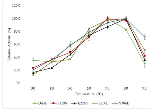 Effects of temperatures on activity of mutated HT1 lipase. The activity was determine using colorimetric assay and the optimum activity of each enzyme was recorded as 100%. The protein concentrations were standardized to 50 µg for each sample. The assays were conducted in triplicate.