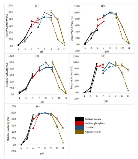 The determination of optimum pH of mutated HT1 lipases was performed using various buffers from pH 4 to 11 following the colorimetric method of Kwon and Rhee [17]. To study the stability of lipases in various pH range, the lipases were pre-incubated for 30 min at 60 °C in different buffers with different pH values followed by standard lipase assay at optimum condition. Most of the mutants were optimally active at Tris-HCl pH 8, except for E250L which displayed a small change in optimal pH (Figure 3). Mutant E250L possessed significantly higher activity at pH 9 by using Glycine-NaOH buffer and was increasingly stable at a broader range of pH of 6 to 11. Meanwhile, other mutants demonstrate stability at pH levels of 6 to 10. These mutants were found to display low activity at acidic pH, retaining relative activity at only 16.2 to 34.9% at pH 5.