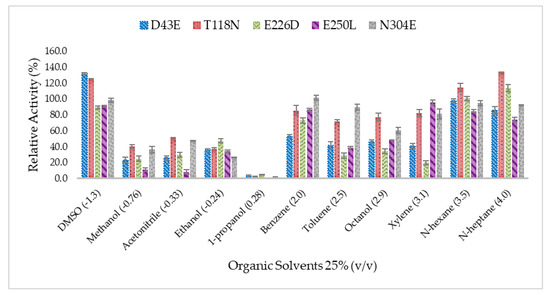 Effect of organic solvents on the catalytic activity of HT1 lipase mutants. The relative activity of each lipase was compared to the untreated lipase without organic solvents. The value of untreated enzyme for each lipase was taken as 100% and not presented in the graph.