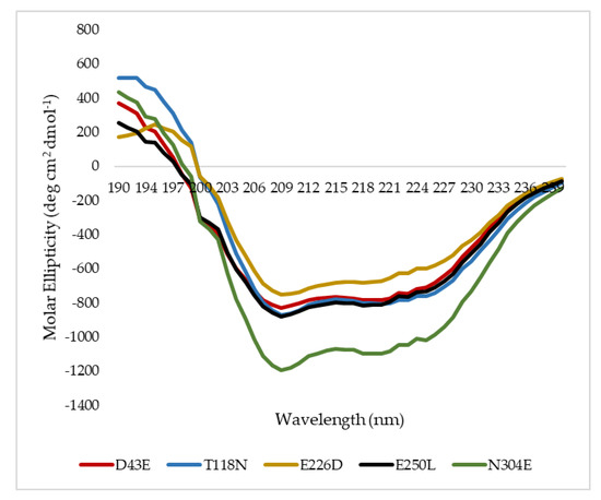 To understand the influence of such mutations on the secondary structure composition of HT1 lipase, all mutated lipases were subjected to structure analysis via far-UV spectrum of circular dichroism. The superimposition of mutated HT1 lipases circular dichroism (CD) spectra at 20 °C was demonstrated (Figure 5) and the secondary structure compositions were measured using Spectra ManagerTM Suite Software (Japan Spectroscopic Company (JASCO), Tokyo, Japan) in which the proportion of secondary structure includes α-helix, β-sheet, turn, and random (Table 3). Mutant N304E showed to be distinctively different as compared to other mutants whereby the values were all negative between the spectra of 230 to 205 nm. However, upon analysis, there was no difference in terms of secondary structure composition between N304E mutant and other mutated HT1 lipases (Table 3). In much lesser thermostable T118N, the β-sheet structure was found to be less than the other lipases. A small decline in β-sheet structure was likely due to the changes in the distribution of intramolecular salt bridges and hydrogen bonding [18,19].