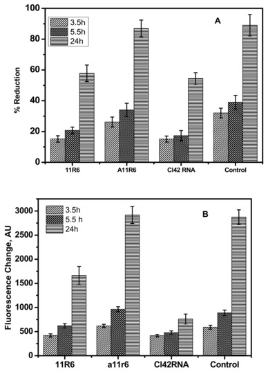 (A) Changes in the percentage reduction (from the absorption) in reduced Alamar blue at 570 nm in the presence of 4T1-Luc2 untreated cells or incubated with anti-VCAM-1 ssDNA full length (11R6), truncated aptamer (A11R6), or anti-IL4Rα RNA aptamers (Cl42RNA) for 3.5, 5.5 and 24 h. (B) Change in the fluorescence intensities of reduced alamar blue at 590 nm in the presence of 4T1-Luc2 cells untreated or incubated with anti-VCAM-1 ssDNA full length (11R6), truncated aptamer (A11R6), or anti-IL4Rα RNA aptamers (Cl42RNA) for 3.5, 5.5 and 24 h.