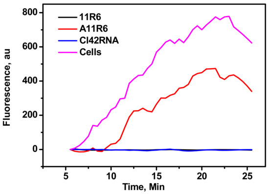 Cells treated with anti-VCAM-1 ssDNA or anti-IL4Rα RNA aptamers showed significant increase in the absorption at 570 nm (Figure 1A) compared to untreated cells. This is presumably due to the lower sensitivity of the UV–Visible absorption spectroscopy compared to fluorescence spectroscopy. In order to further confirm this hypothesis, more sensitive fluorescence measurements were carried out to assess the effects of aptamers on the cell growth factor. The fluorescence intensity of the reduced form of dye (Em = 590 nm) was found to increase relatively significantly, with the incubation time in the untreated cells or with truncated VCAM-1 aptamer (A11R6) (Figure 1B). However, no significant increase in the fluorescence intensity of Cl42RNA aptamers incubated with cancer cells was observed. The considerable increase in the fluorescence intensity in the presence of 11R6 compared to Cl42RNA might be due to the lower affinity of 11R6 with VCAM-1.