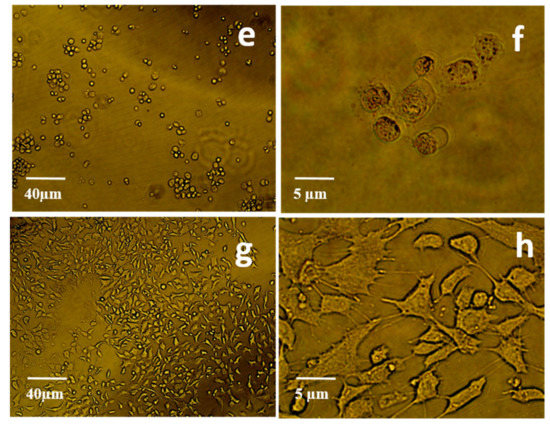 To check whether the aptamers have the potential to promote an apoptotic effect on 4T1 tumor cells, the cells were incubated overnight with or without the aptamers in the growth media and microscopic images of the cells were captured. Cells incubated under normal conditions (Figure 3c,d) and with the truncated VCAM-1 aptamer (Figure 3g,h) appeared healthy and were found to adhere to the walls of the culture flask. However, cells incubated with either full length anti-VCAM-1 (Figure 3a,b) or anti-Il4Rα aptamers (Figure 3e,f) indicated that the aptamers might have a significant effect on the depletion of cell population in vitro. This observation was further confirmed with the absence of bioluminescence and fluorescence signals.
