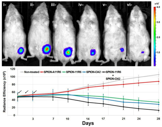 In vivo aptamer-conjugated SPIO nanoparticles therapeutic efficacy assessed using noninvasive BLI. Representative bioluminescence images (upper row) and corresponding quantitative assessments of radiance efficiency (lower row) in 4T1 tumor-bearing mice. Noninvasive imaging protocols were performed pre- (t = 0; corresponding to three-weeks post-tumor cell inoculation in the mammary fat pad) and up to 28 days post-injection of three consecutive doses (24 h interval time) of different aptamer therapeutic formulations. Black arrows highlight the injection time points. (i) pre-injection; (ii) non-treated mice; (iii) SPION-A11R6; (iv) SPION-11R6; (v) SPION-Cl42RNA; (vi) combined SPION-11R6 and SPION-Cl42RNA mice injected groups. Data are expressed as mean ± SD, n = 3 per group.